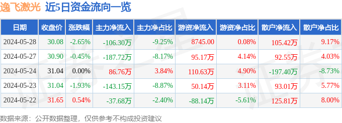 逸飞激光(688646)5月28日主力资金净卖出106.30万元