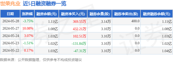 世荣兆业融资融券信息显示,融资方面,当日融资买入1023.12万元,融资偿还653.57万元,融资净买入369.55万元,连续3日净买入累计904.27万元。融券方面,融券卖出400.0股,融券偿还0.0股,融券余量3.14万股,融券余额20.13万元。融资融券余额1.11亿元。近5日融资融券数据一览见下表: