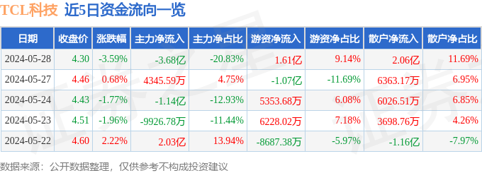 TCL科技(000100)5月28日主力资金净卖出3.68亿元