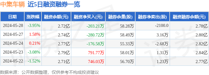 中集车辆融资融券信息显示,融资方面,当日融资买入1739.9万元,融资偿还1943.11万元,融资净偿还203.21万元。融券方面,融券卖出4200.0股,融券偿还6300.0股,融券余量58.28万股,融券余额538.53万元。融资融券余额2.78亿元。近5日融资融券数据一览见下表: