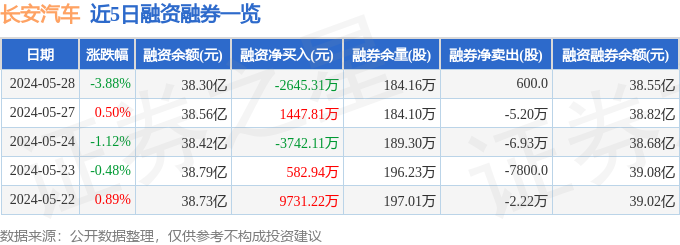 长安汽车融资融券信息显示,融资方面,当日融资买入2.1亿元,融资偿还2.37亿元,融资净偿还2645.31万元。融券方面,融券卖出7.28万股,融券偿还7.22万股,融券余量184.16万股,融券余额2508.25万元。融资融券余额38.55亿元。近5日融资融券数据一览见下表: