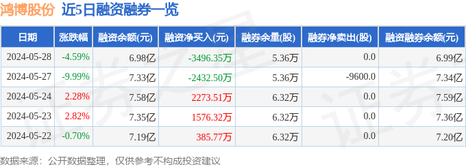 鸿博股份融资融券信息显示,融资方面,当日融资买入2546.8万元,融资偿还6043.15万元,融资净偿还3496.35万元。融券方面,融券卖出0.0股,融券偿还0.0股,融券余量5.36万股,融券余额82.49万元。融资融券余额6.99亿元。近5日融资融券数据一览见下表:
