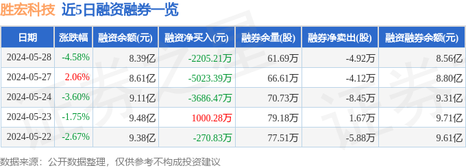 财经消息,截至2024年5月28日收盘,胜宏科技(300476)报收于26.89元,下跌4.58%,换手率4.07%,成交量34.79万手,成交额9.46亿元。