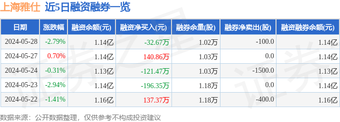上海雅仕融资融券信息显示,融资方面,当日融资买入208.49万元,融资偿还241.16万元,融资净偿还32.67万元。融券方面,融券卖出0.0股,融券偿还100.0股,融券余量1.02万股,融券余额12.81万元。融资融券余额1.14亿元。近5日融资融券数据一览见下表: