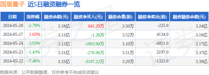 国盾量子融资融券信息显示,融资方面,当日融资买入1812.5万元,融资偿还1171.22万元,融资净买入641.29万元。融券方面,融券卖出1400.0股,融券偿还1625.0股,融券余量3.5万股,融券余额564.48万元。融资融券余额3.24亿元。近5日融资融券数据一览见下表: