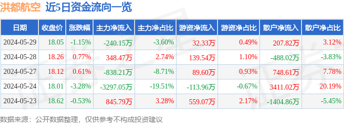 股票行情快报:洪都航空(600316)5月29日主力资金净卖出240.15万元
