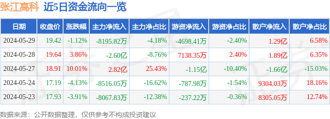 财经消息,截至2024年5月29日收盘,张江高科(600895)报收于19.42元,下跌1.12%,换手率6.41%,成交量99.22万手,成交额19.6亿元。
