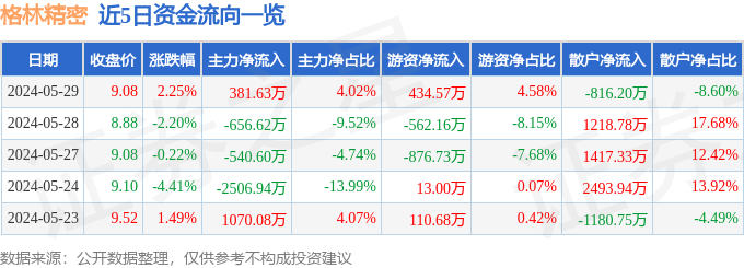 股票行情快报:格林精密(300968)5月29日主力资金净买入381.63万元