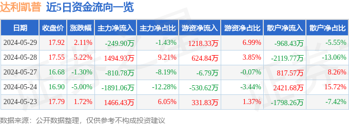 5月29日的资金流向数据方面,主力资金净流出249.9万元,占总成交额1.43%,游资资金净流入1218.33万元,占总成交额6.99%,散户资金净流出968.43万元,占总成交额5.55%。