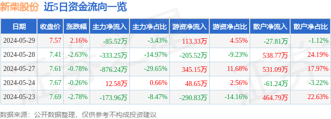 股票行情快报:新柴股份(301032)5月29日主力资金净卖出85.52万元