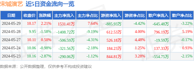 股票行情快报:宋城演艺(300144)5月29日主力资金净买入1531.41万元