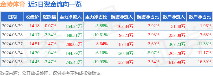 股票行情快报:金陵体育(300651)5月29日主力资金净卖出154.24万元