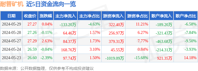 股票行情快报:耐普矿机(300818)5月29日主力资金净卖出133.20万元