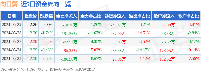 股票行情快报:向日葵(300111)5月29日主力资金净卖出18.26万元