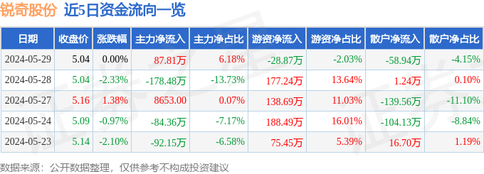 5月29日的资金流向数据方面,主力资金净流入87.81万元,占总成交额6.18%,游资资金净流出28.87万元,占总成交额2.03%,散户资金净流出58.94万元,占总成交额4.15%。