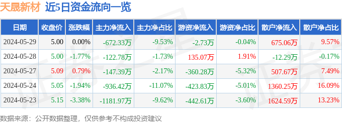 股票行情快报:天晟新材(300169)5月29日主力资金净卖出672.33万元