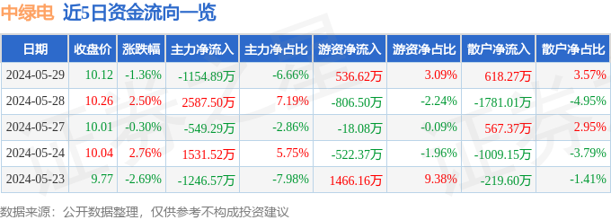 股票行情快报:中绿电(000537)5月29日主力资金净卖出1154.89万元