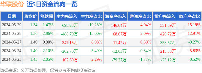 股票行情快报:华联股份(000882)5月29日主力资金净卖出698.23万元
