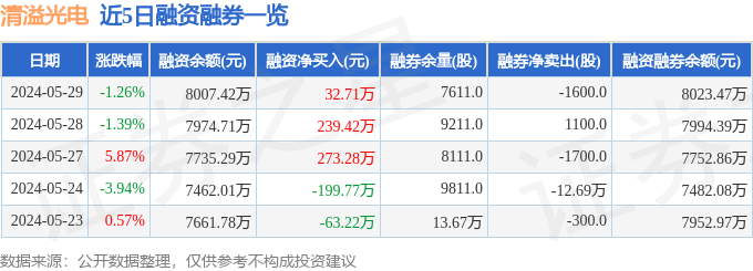 清溢光电融资融券信息显示,融资方面,当日融资买入330.6万元,融资偿还297.89万元,融资净买入32.71万元,连续3日净买入累计545.41万元。融券方面,融券卖出200.0股,融券偿还1800.0股,融券余量7611.0股,融券余额16.05万元。融资融券余额8023.47万元。近5日融资融券数据一览见下表: