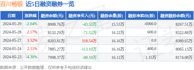 百川畅银融资融券信息显示,融资方面,当日融资买入295.99万元,融资偿还339.52万元,融资净偿还43.53万元。融券方面,融券卖出2000.0股,融券偿还8900.0股,融券余量15.53万股,融券余额178.75万元。融资融券余额8267.51万元。近5日融资融券数据一览见下表: