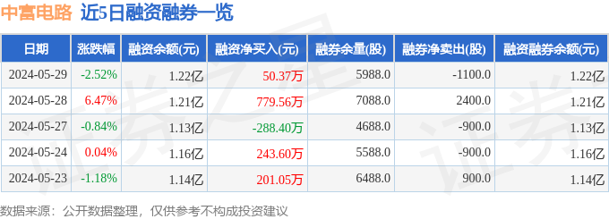 中富电路融资融券信息显示,融资方面,当日融资买入2255.36万元,融资偿还2204.98万元,融资净买入50.37万元。融券方面,融券卖出200.0股,融券偿还1300.0股,融券余量5988.0股,融券余额17.57万元。融资融券余额1.22亿元。近5日融资融券数据一览见下表: