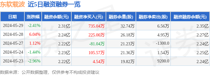 东软载波融资融券信息显示,融资方面,当日融资买入1542.01万元,融资偿还806.97万元,融资净买入735.04万元。融券方面,融券卖出8.98万股,融券偿还2.42万股,融券余量32.74万股,融券余额398.18万元。融资融券余额2.35亿元。近5日融资融券数据一览见下表: