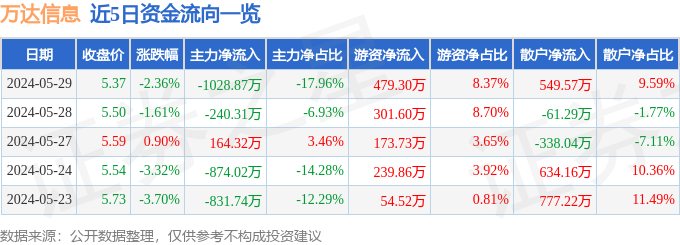 万达信息(300168)5月29日主力资金净卖出1028.87万元