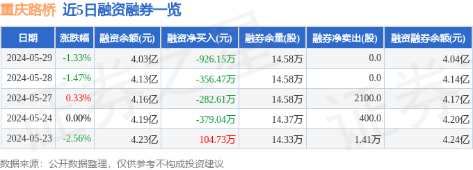 重庆路桥融资融券信息显示,融资方面,当日融资买入1009.92万元,融资偿还1936.07万元,融资净偿还926.15万元。融券方面,融券卖出0.0股,融券偿还0.0股,融券余量14.58万股,融券余额86.61万元。融资融券余额4.04亿元。近5日融资融券数据一览见下表: