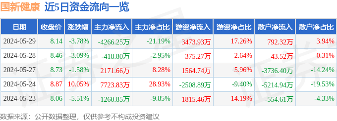 财经消息,截至2024年5月29日收盘,国新健康(000503)报收于8.14元,下跌3.78%,换手率2.74%,成交量24.64万手,成交额2.01亿元。