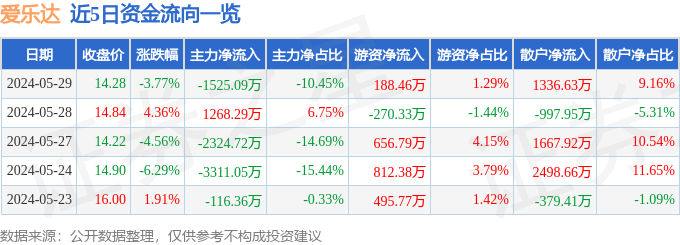 5月29日的资金流向数据方面,主力资金净流出1525.09万元,占总成交额10.45%,游资资金净流入188.46万元,占总成交额1.29%,散户资金净流入1336.63万元,占总成交额9.16%。