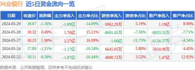 财经消息,截至2024年5月29日收盘,兴业银行(601166)报收于18.07元,下跌1.36%,换手率0.36%,成交量73.76万手,成交额13.4亿元。