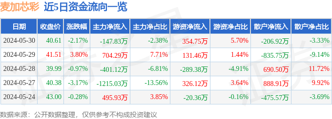 5月30日的资金流向数据方面,主力资金净流出147.83万元,占总成交额2.38%,游资资金净流入354.75万元,占总成交额5.7%,散户资金净流出206.92万元,占总成交额3.33%。