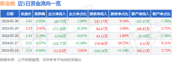 财经消息,截至2024年5月30日收盘,新金路(000510)报收于3.43元,下跌2.83%,换手率1.37%,成交量7.79万手,成交额2703.98万元。