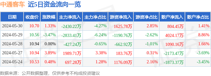 财经消息,截至2024年5月30日收盘,中通客车(000957)报收于10.7元,上涨1.33%,换手率8.86%,成交量52.5万手,成交额5.7亿元。
