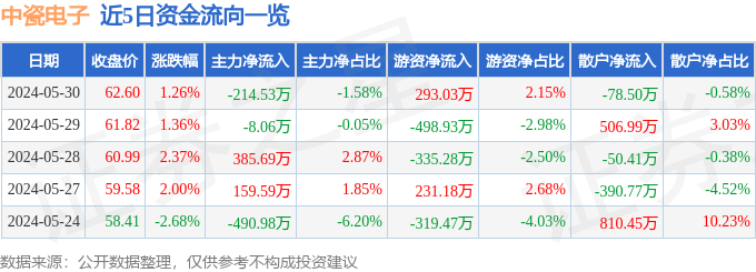 股票行情快报:中瓷电子(003031)5月30日主力资金净卖出214.53万元