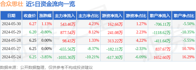 5月30日的资金流向数据方面,主力资金净流入543.46万元,占总成交额4.23%,游资资金净流入162.66万元,占总成交额1.27%,散户资金净流出706.11万元,占总成交额5.5%。