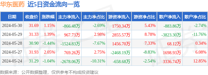 股票行情快报:华东医药(000963)5月30日主力资金净卖出866.48万元