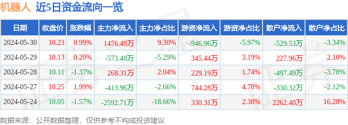 财经消息,截至2024年5月30日收盘,机器人(300024)报收于10.23元,上涨0.99%,换手率1.03%,成交量15.57万手,成交额1.59亿元。
