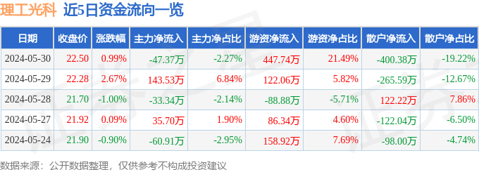 5月30日的资金流向数据方面,主力资金净流出47.37万元,占总成交额2.27%,游资资金净流入447.74万元,占总成交额21.49%,散户资金净流出400.38万元,占总成交额19.22%。