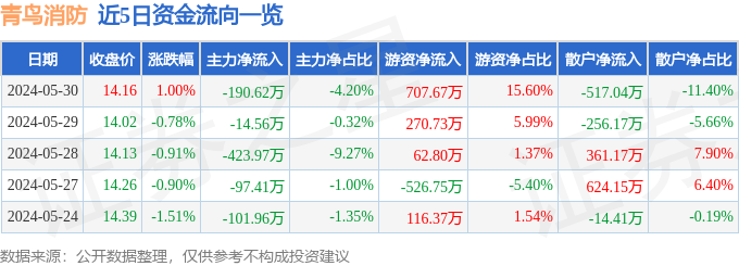 股票行情快报:青鸟消防(002960)5月30日主力资金净卖出190.62万元