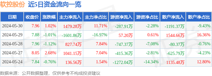 财经消息,截至2024年5月30日收盘,软控股份(002073)报收于7.96元,上涨1.02%,换手率1.65%,成交量15.79万手,成交额1.26亿元。