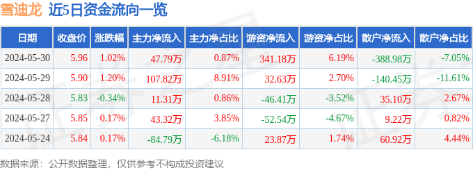 5月30日的资金流向数据方面,主力资金净流入47.79万元,占总成交额0.87%,游资资金净流入341.18万元,占总成交额6.19%,散户资金净流出388.98万元,占总成交额7.05%。