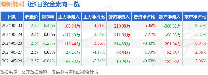 5月30日的资金流向数据方面,主力资金净流入169.84万元,占总成交额4.31%,游资资金净流入210.98万元,占总成交额5.36%,散户资金净流出380.82万元,占总成交额9.67%。