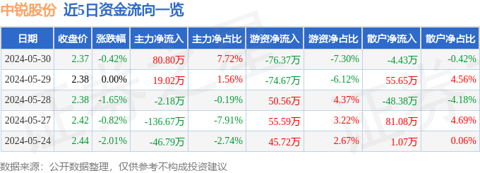 股票行情快报:中锐股份(002374)5月30日主力资金净买入80.80万元