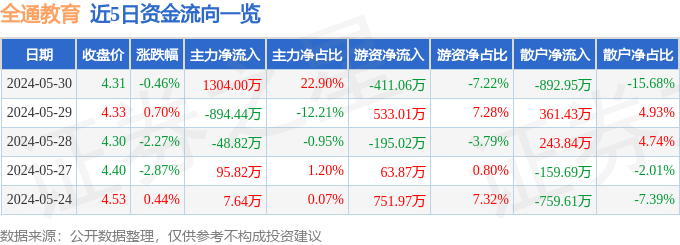 财经消息,截至2024年5月30日收盘,全通教育(300359)报收于4.31元,下跌0.46%,换手率2.08%,成交量13.17万手,成交额5694.6万元。