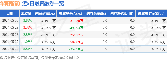 华阳智能融资融券信息显示,融资方面,当日融资买入630.57万元,融资偿还314.27万元,融资净买入316.3万元。融券方面,融券卖出0.0股,融券偿还0.0股,融券余量0.0股,融券余额0.0万元。融资融券余额3919.16万元。近5日融资融券数据一览见下表: