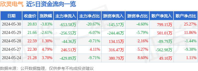 欣灵电气(301388)5月30日主力资金净卖出653.58万元