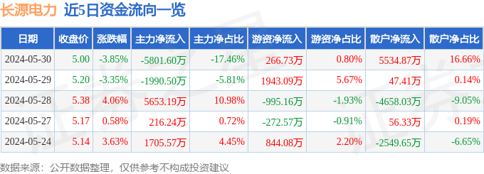 长源电力(000966)5月30日主力资金净卖出5801.60万元