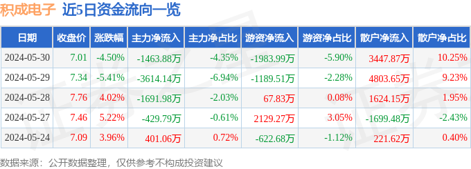 积成电子(002339)5月30日主力资金净卖出1463.88万元