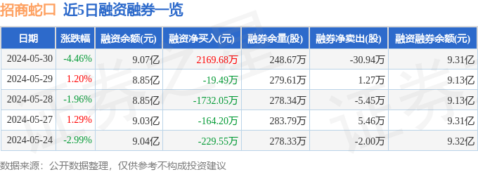 招商蛇口融资融券信息显示,融资方面,当日融资买入9333.39万元,融资偿还7163.7万元,融资净买入2169.68万元。融券方面,融券卖出27.52万股,融券偿还58.46万股,融券余量248.67万股,融券余额2399.64万元。融资融券余额9.31亿元。近5日融资融券数据一览见下表: